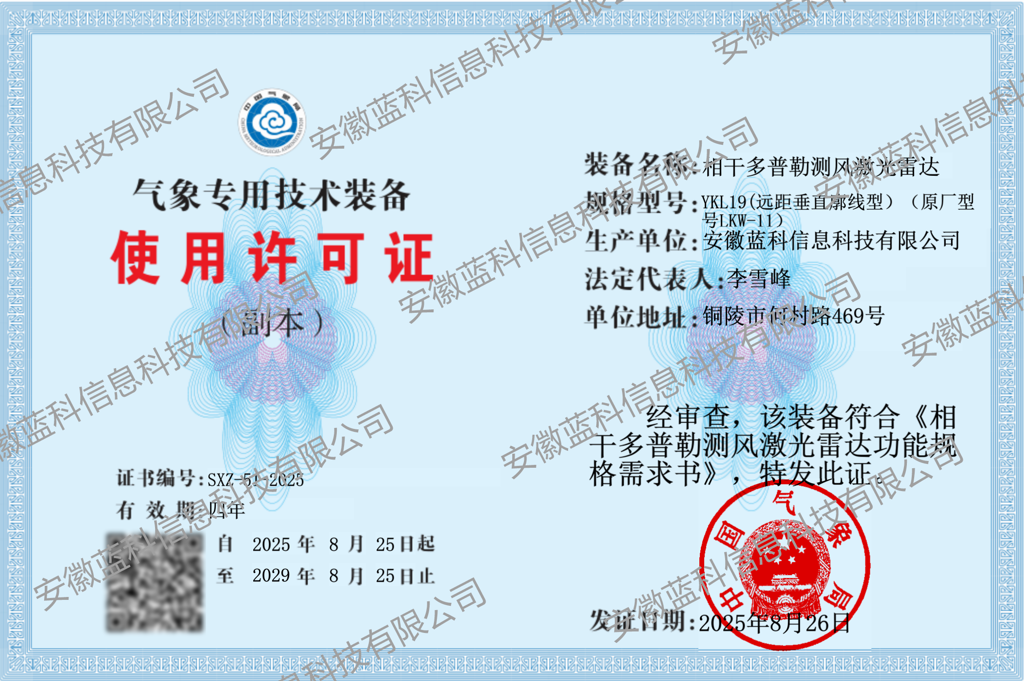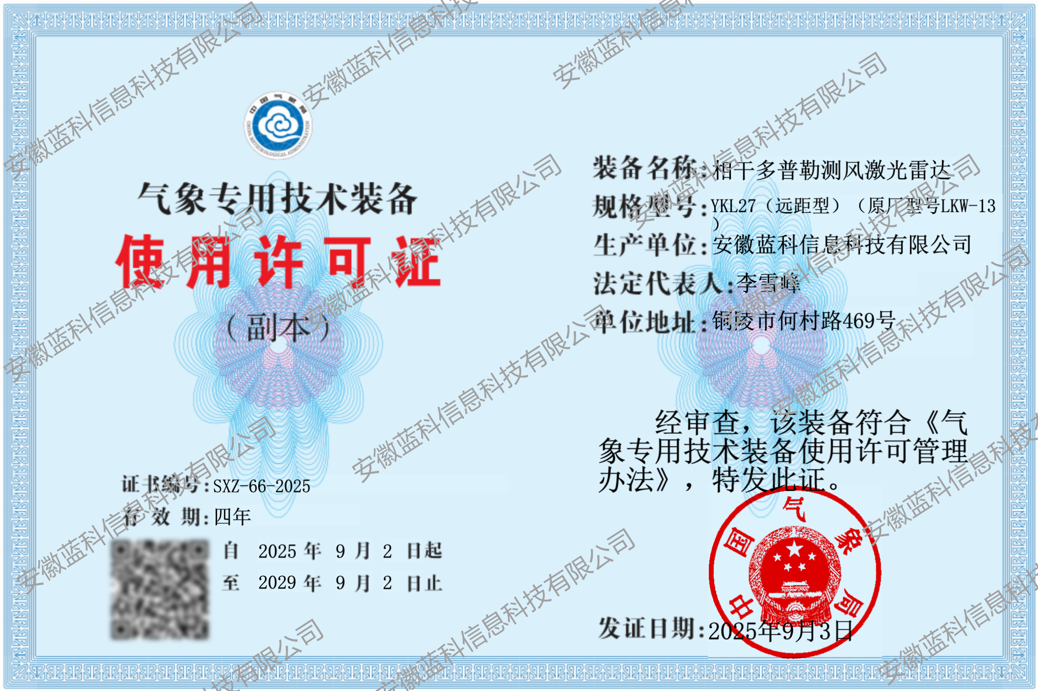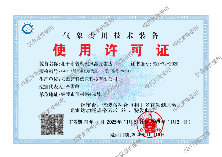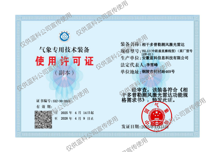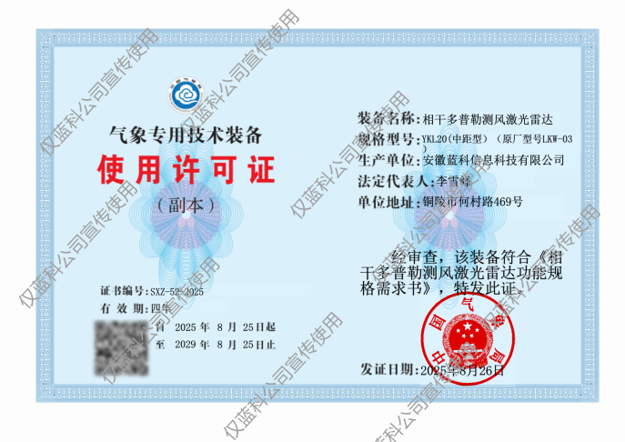 目前,公司近、中、远全系列测风激光雷达均通过中国气象局技术审查和考核,获批气象专用技术装备使用许可证。